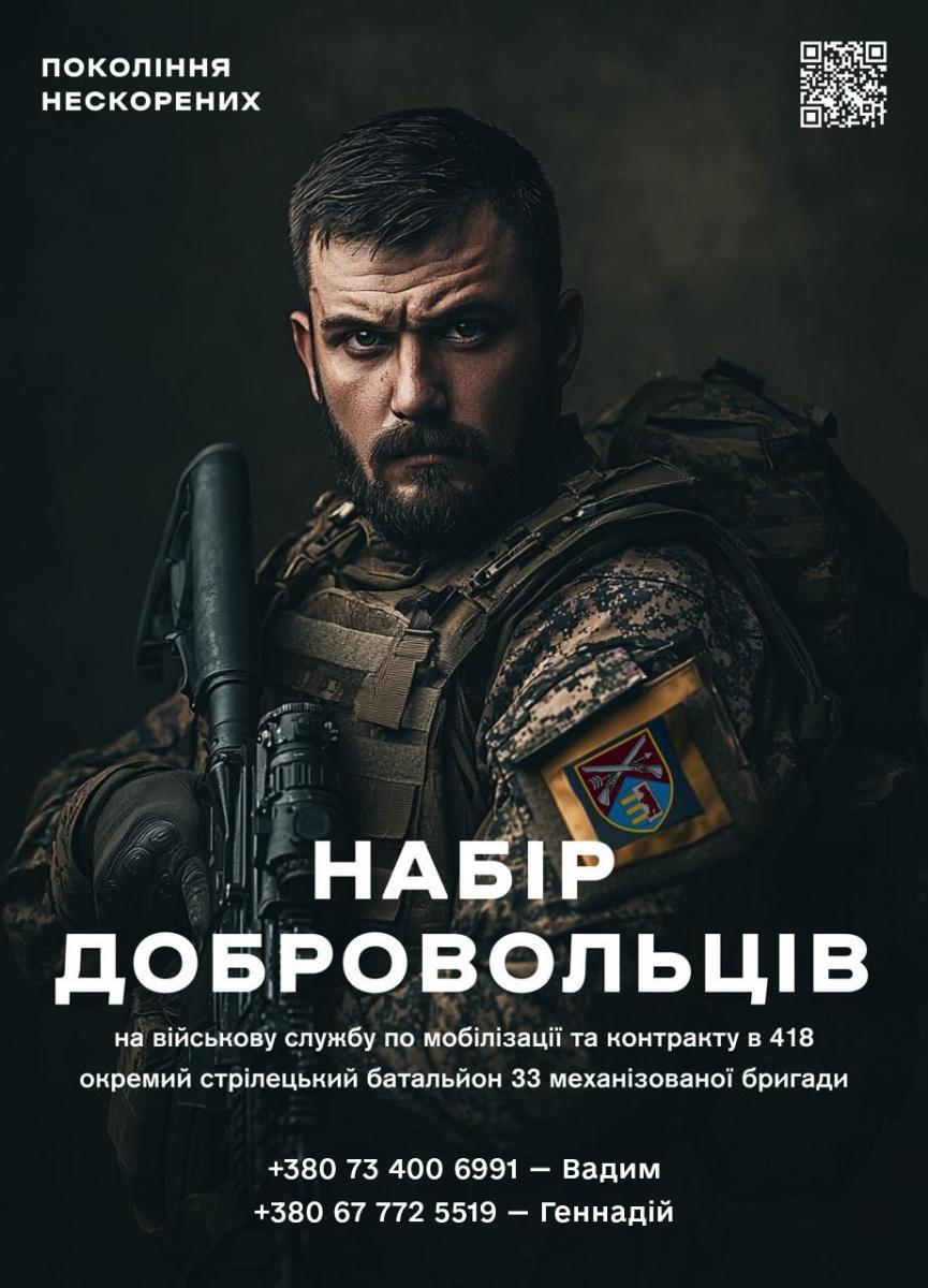 Якщо ти хочеш зробити свій внесок в історію України та взяти участь у захисті Батьківщини - приєднуйся до 418-го окремого стрілецького батальйону 33-ї механізованої бригади ЗСУ.