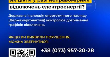 Державна інспекція енергетичного нагляду (Держенергонагляд) контролює дотримання графіків відключень. Якщо ви виявили порушення, можна звернутися: