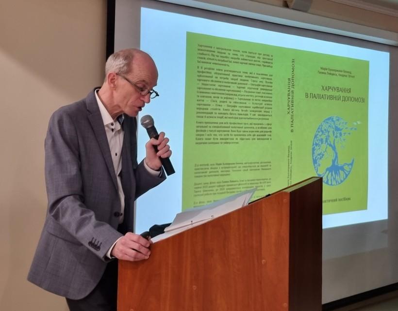 Олександра Бойчук подякувала автору книги Андреасу Штелі та доцентці Галині Лейцюсь за внесок у розвиток паліативної підтримки й наголосила на важливості впровадження європейських практик та розвитку культури емпатійної допомоги.