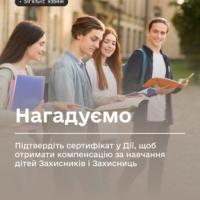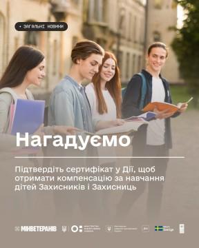 Діти ветеранів й ветеранок отримують від держави сертифікати на компенсацію вартості навчання за контрактом у закладах професійної, фахової передвищої та вищої освіти за 2024 – 2025 навчальний рік. Сертифікати надсилаються поетапно через застосунок Дія.