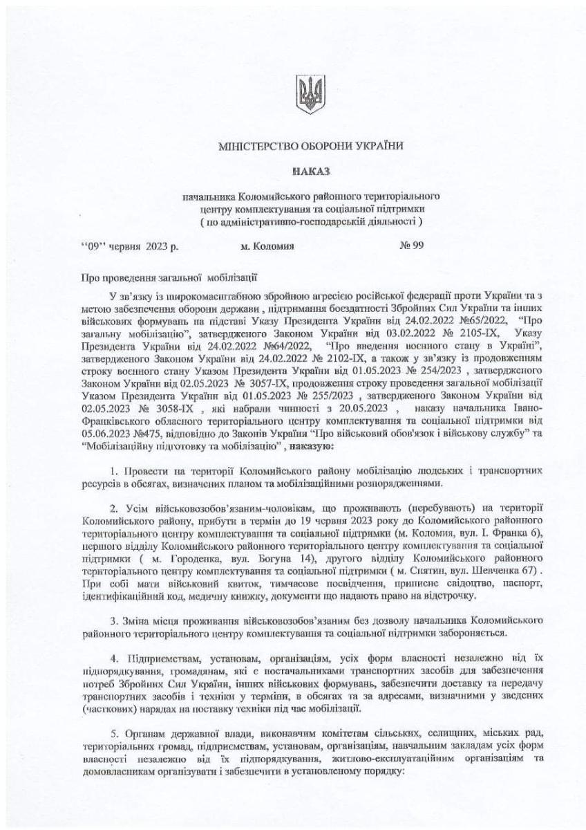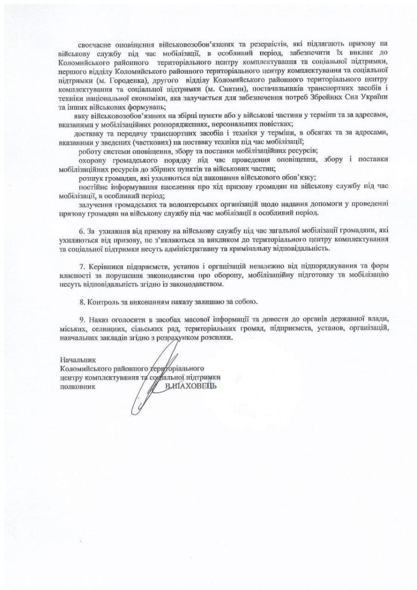 Наказ начальника Коломийського районного територіального центру комплектування та соціальної підтримки «Про проведення загальної мобілізації»