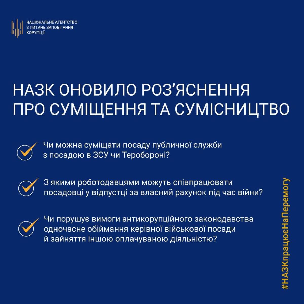 Після внесення змін до Закону України «Про запобігання корупції» щодо особливостей застосування законодавства у сфері запобігання корупції в умовах воєнного стану Національне агентство з питань запобігання корупції (НАЗК) підготувало роз’яснення про сумісництво та суміщення.