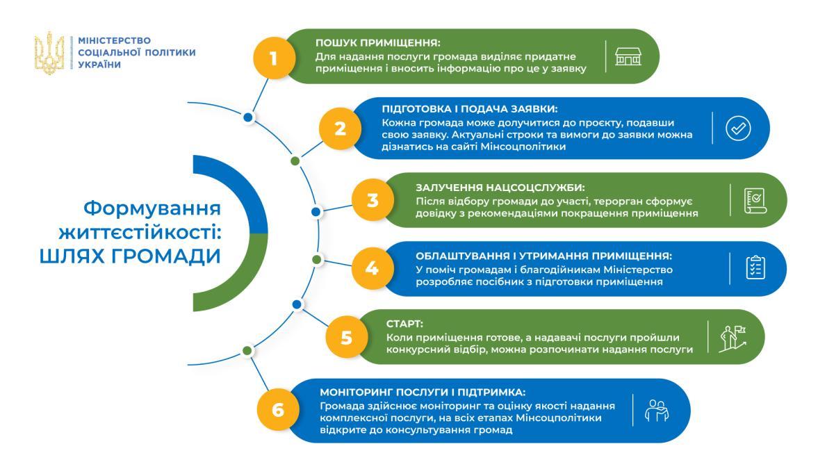 Послуга реалізовуватиметься через територіальні громади. Нагадаємо, будь-яка територіальна громада України може подати свою заявку на участь у проєкті. Строки подання заявки оновлюються на сайті Міністерства соціальної політики. Єдина умова - підготувати та утримувати приміщення для надання послуги.