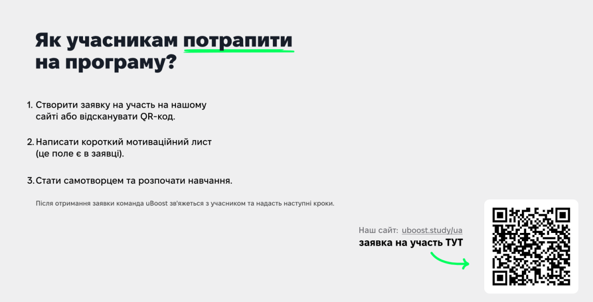 На проєкті uBoost учасники розвивають гнучкі навички (soft skills), вчаться запускати власні проєкти, знаходять однодумців та отримують підтримку від дорослих, які вже здобули визнання.