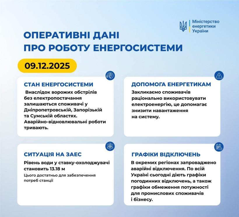 Внаслідок ворожих обстрілів по енергетичній інфраструктурі на ранок без електропостачання залишаються споживачі у Дніпропетровській, Запорізькій та Сумській областях. Аварійно-відновлювальні роботи тривають, енергетики працюють безперервно, щоб якнайшвидше відновити електропостачання.