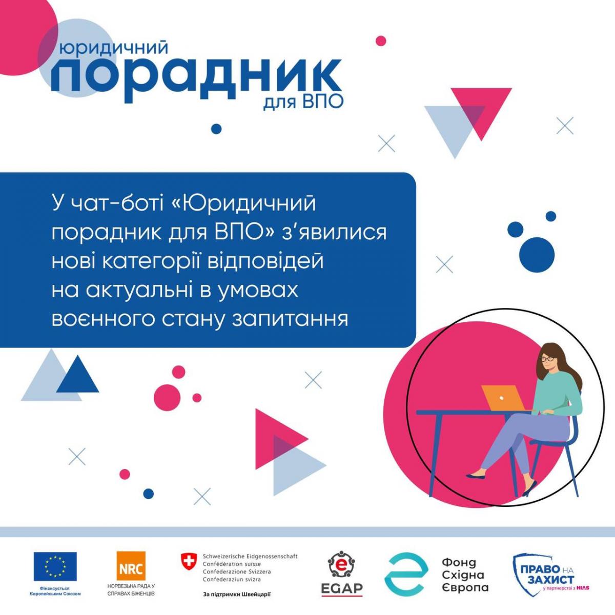 У чат-боті «Юридичний порадник для ВПО» з’явилися нові категорії відповідей на актуальні в умовах воєнного стану запитання.