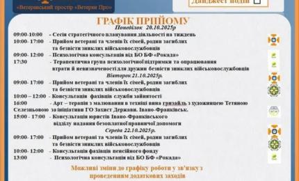Графік роботи Ветеранського простору «Ветеран Про» на тиждень з 20 по 24 жовтня 2025 року