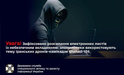 Увага! Зафіксовано розсилання електронних листів із небезпечним вкладенням: зловмисники використовують тему іранських дронів-камікадзе Shahed-136